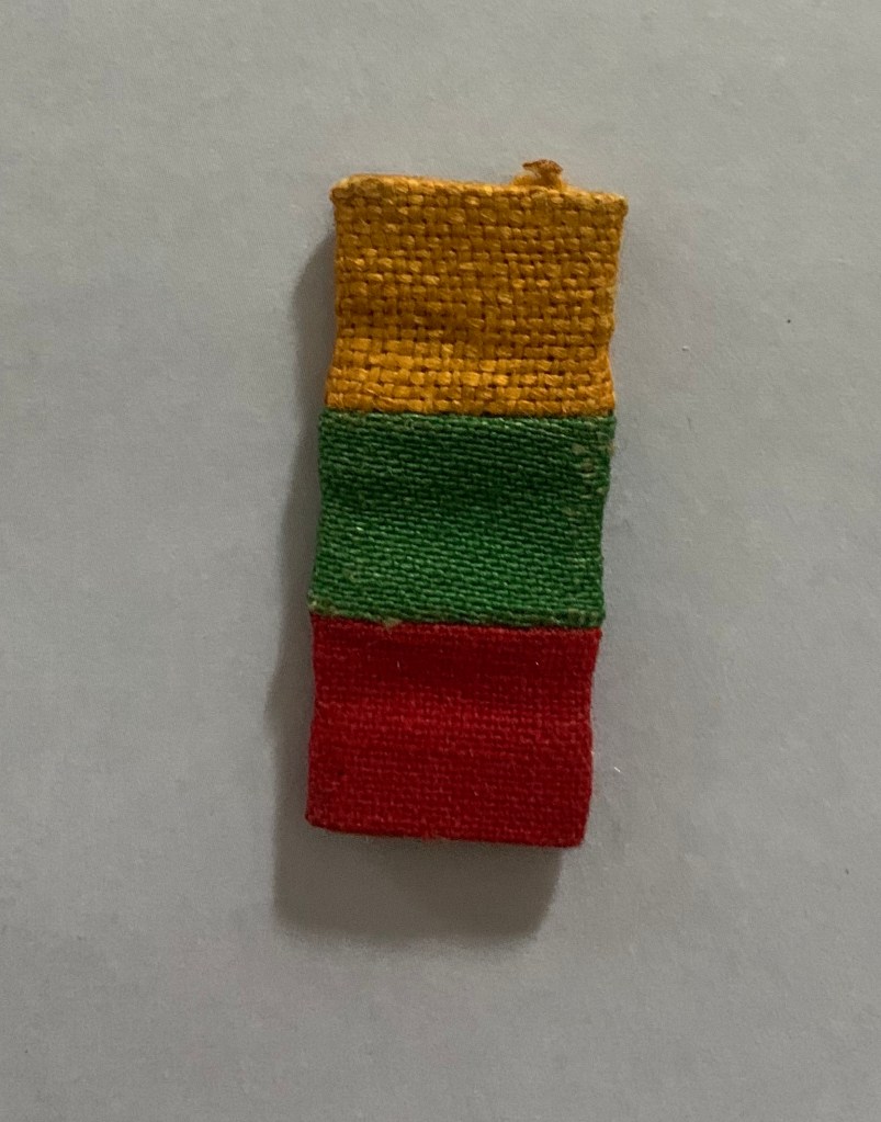 But my mom did have a tiny Lithuanian flag. It’s 3.5 centimetres long and 1.5 centimetres wide, made out of cardboard with the yellow, green, and red of the flag wrapped around it, a few black stitches bonding it together. My grandmother made this in a refugee camp in Germany after she fled with her daughter, my mother, during the second world war.