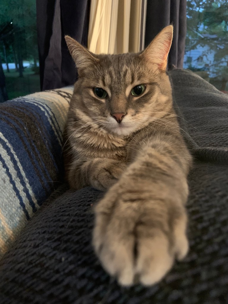 Močkė, my grey tabby, is very much a chatterbox. She squeals if I pat her when she’s sleeping. She makes that “eh, eh, eh” sound while watching birds and other critters attack the suet feeders outside the window. If you’re not familiar with cats, it sounds like this. I’d love to share a video of Močkė doing it but every time I start recording her, she stops. Just what I’d expect from a cat. She’ll decide if and when she wants to be videoed.