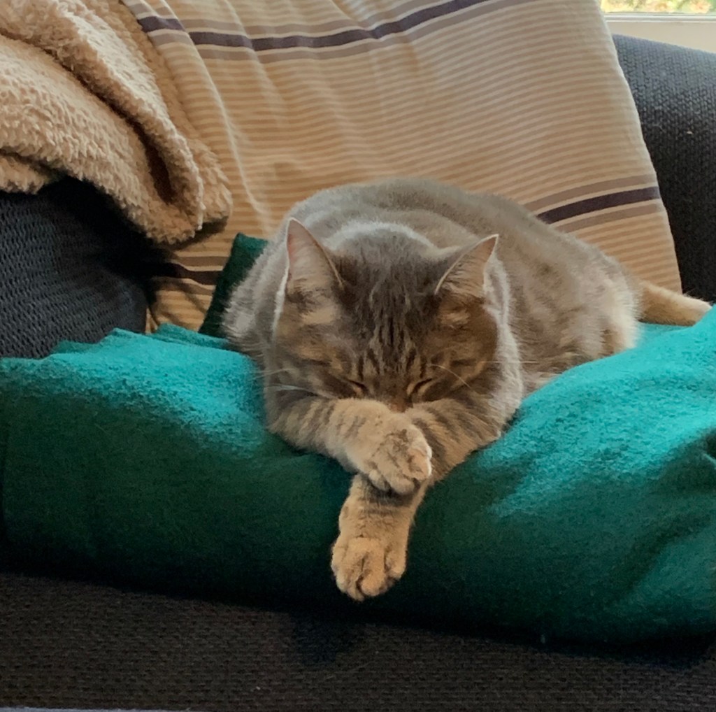 It surprised me to learn that cats will chatter away while in dreamland. I don’t ever remember any of my previous fur babies talking in their sleep. Dogs, yep. You see their legs and paws twitching as they run after a ball, a bone, another dog, a squirrel while taking a doggy nap. But cats?
